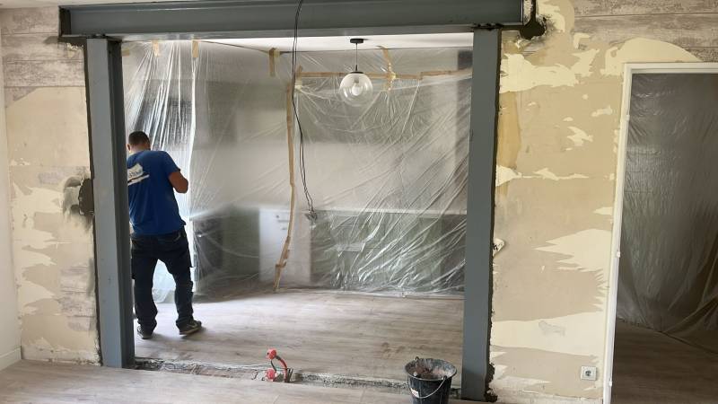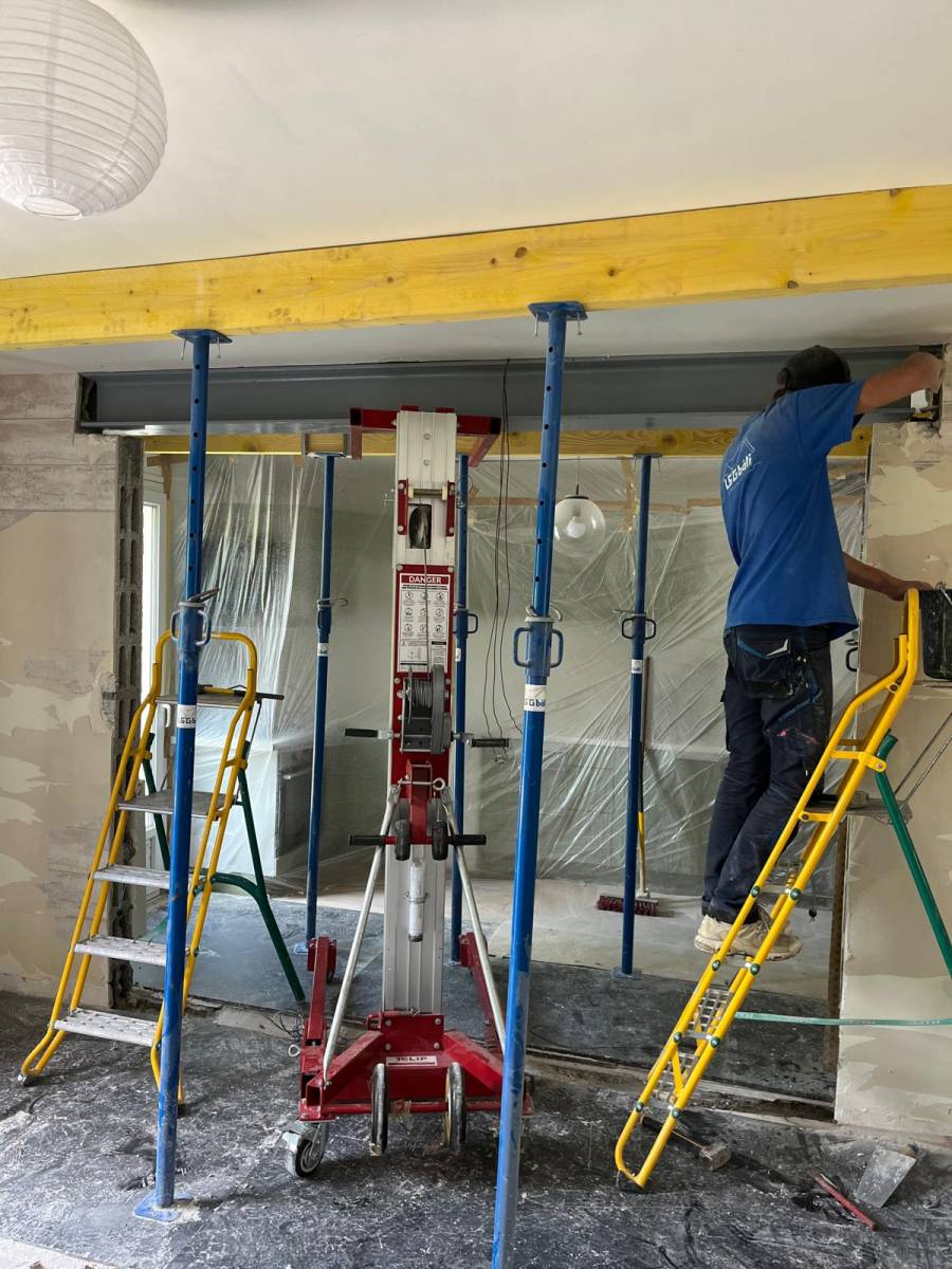Enfin, la pose d’un linteau en acier (HEA) a permis de reprendre les charges initialement supportées par le mur, assurant ainsi la sécurité de l’ensemble. Ce type de structure métallique garantit une solidité optimale tout en offrant une ouverture durable et esthétique, prête à accueillir une nouvelle configuration d’espace.