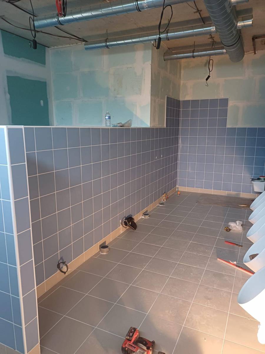 Après une première étape de pose de carreaux de plâtre pour garantir et refaire des cloisons solides et durables, nous avons procédé à la pose de carrelage au sol avec des plinthes assorties. Le choix de matériaux adaptés à une utilisation quotidienne et intensive a permis de répondre aux exigences d’hygiène et de sécurité de l’école. Ensuite, nous avons installé une faïence murale élégante, apportant une finition esthétique tout en facilitant l’entretien quotidien des sanitaires.