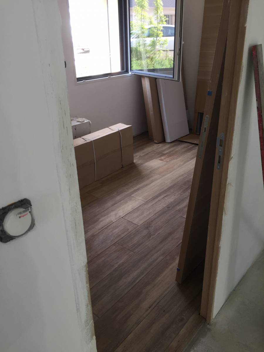 Pose de carrelage imitation parquet, dans une maison à Saint-Romain-de-Colbosc
