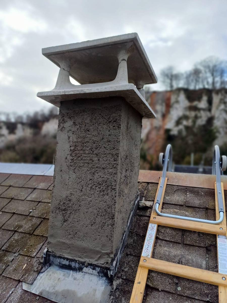 Pour protéger la structure réparée et lui donner une finition esthétique, nous avons posé une toile de protection et appliqué un enduit mono décor allégé en blanc. Cette couche d'enduit offre une protection supplémentaire contre les intempéries tout en apportant une touche de fraîcheur et de luminosité à la cheminée.