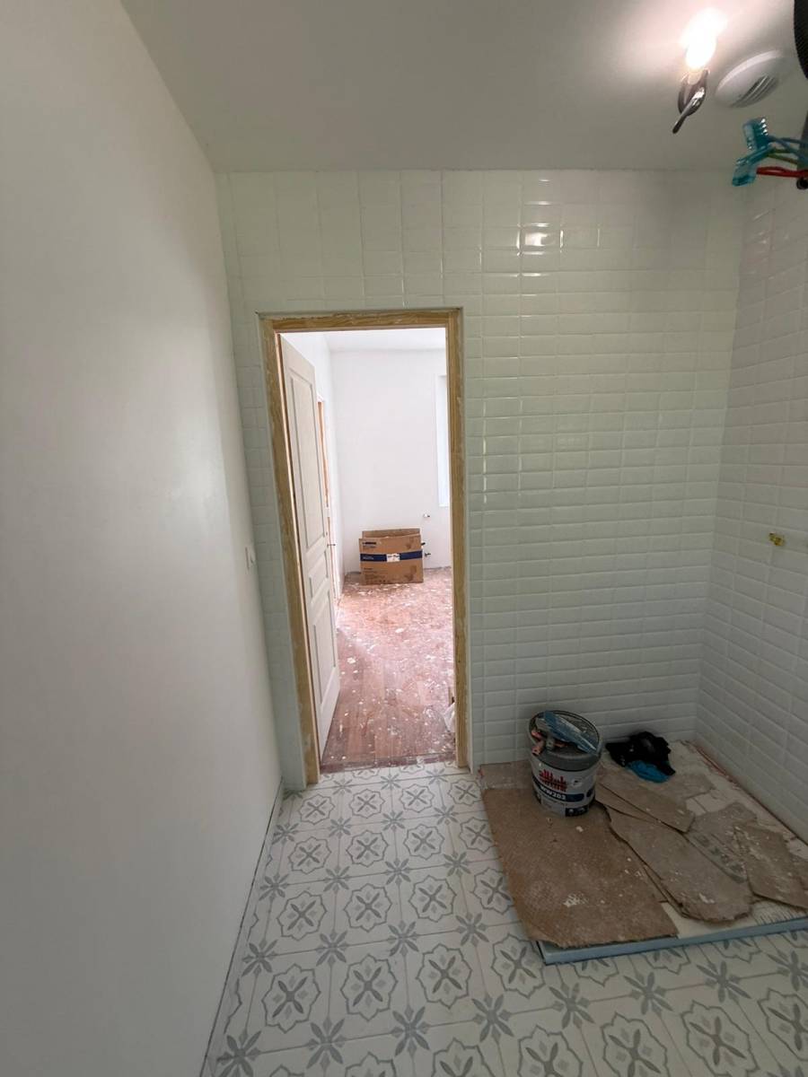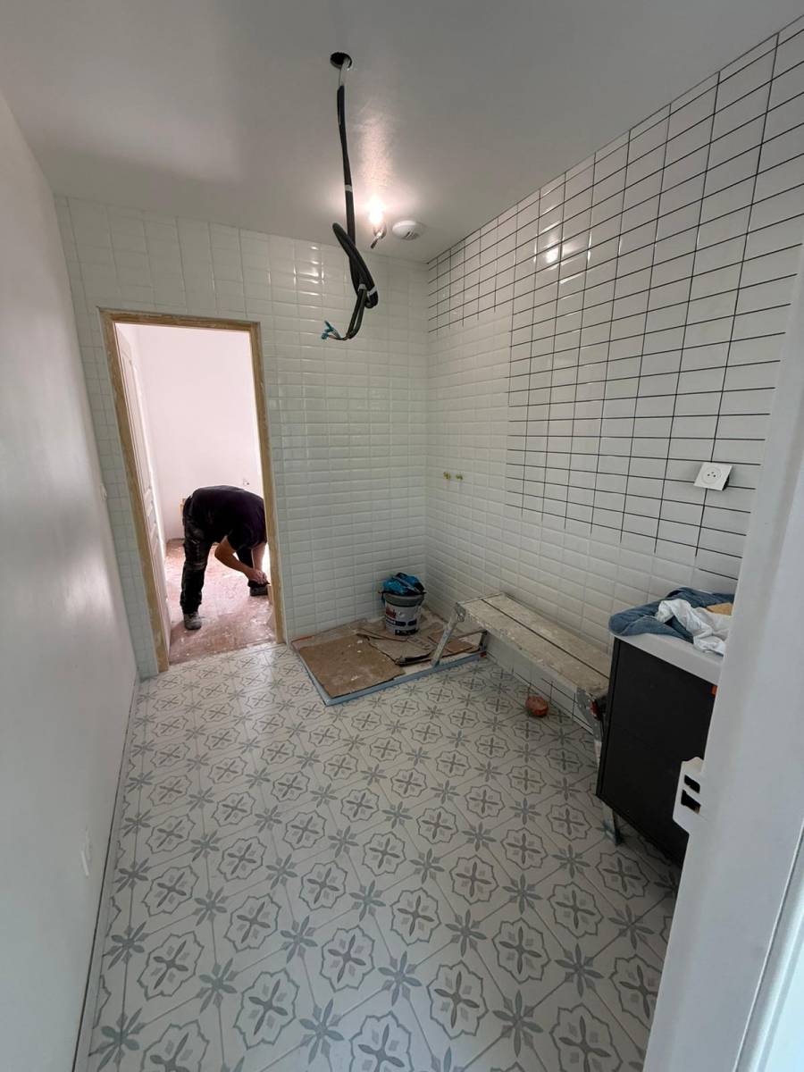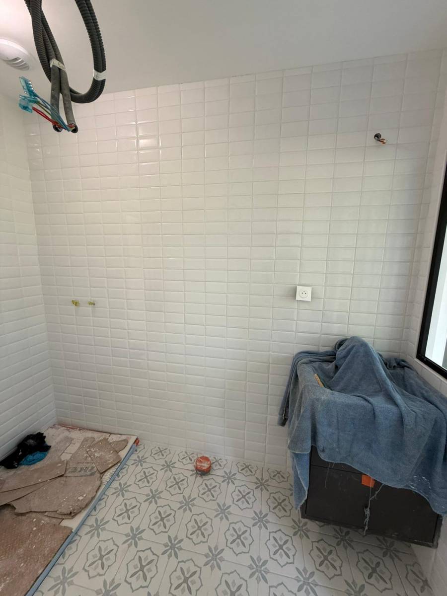 Parmi les pièces marquantes de cette rénovation, la salle de bain a fait l’objet d’une transformation particulièrement soignée. Le choix des matériaux a été guidé par le goût du client et notre volonté d’allier authenticité et modernité. Nous avons ainsi posé une faïence blanche de style “métro parisien”, apportant clarté et élégance à l’espace. Pour le sol, le client a opté pour un carrelage à motifs aspect ancien, rappelant les carreaux de ciment bleutés qui offrent un charme intemporel et une personnalité unique à la pièce.
